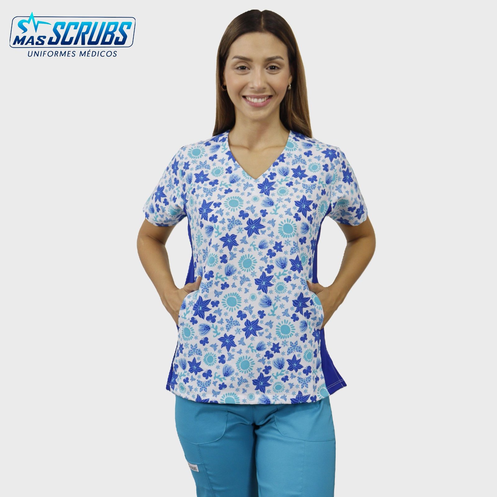 Chaqueta para dama diseño en tonos azulino, con licra a los lados y bolsillos a los costados